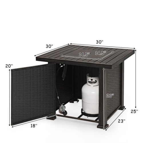 This durable 50,000 BTU Square Propane Gas Fire Pit Table with Table Cover is a versatile piece of patio furniture that you’ll find yourself using all year round. Sturdy and stable steel material provides strong durability. Equipped with electronic ignition and in-built control panel. Table cover with pull-tab for convenience. Lava rocks included to beautifully accent the flames. Door with handle for hidden the inner space. Suitable for 20 lbs. propane stove. Assembly Required. Propane tank NOT included.
