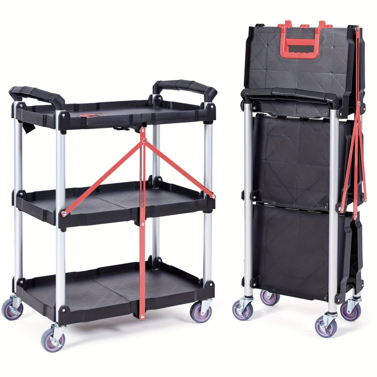Versatile 3-Tier Foldable Cart with Locking Wheels – Portable 3-Tier Work Cart with 4 Wheels (2 Lockable), Ideal for Home/Office/Warehouse